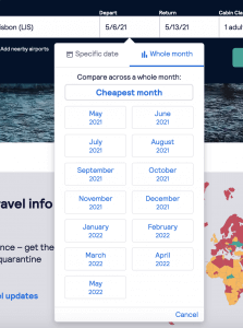 Similarly, if you aren’t picky about when you travel, you can search by entire months, or choose Skyscanner's “Cheapest Month” option to search for the cheapest month for flights based on the locations chosen.